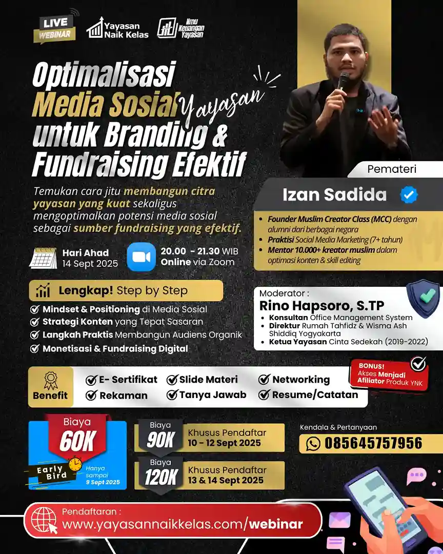 Bagi Anda yang peduli dengan dakwah dan ingin mendorong yayasan lebih dipercaya publik, webinar ini membuka jalan kontribusi nyata.